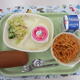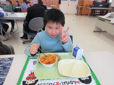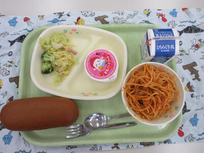 今日のメニューは、小さい黒糖パン、牛乳、スパゲティボロネーゼ、イタリアンサラダ、豆乳パンナコッタ(いちごソース)でした。
