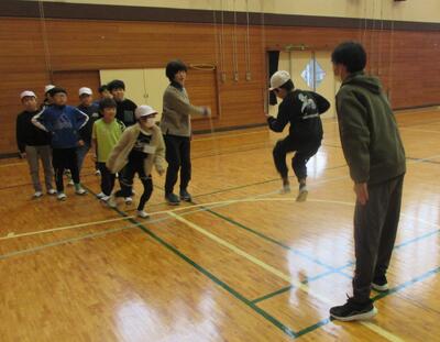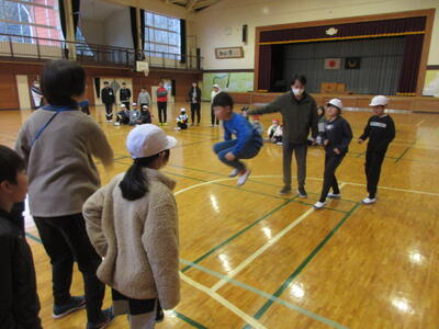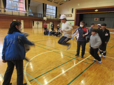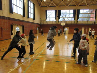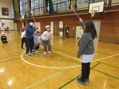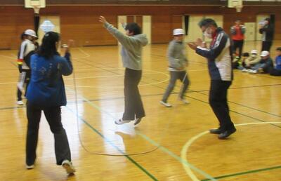 1分間の長縄跳びで、何回跳べるかに挑戦します。