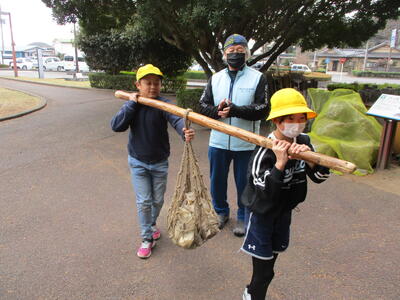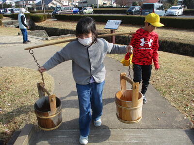 那須野が原の開拓についてのお話を聞いた後に、もっこ担ぎと水運びの体験をしました。