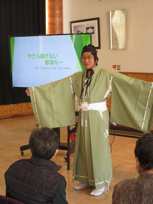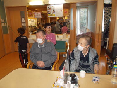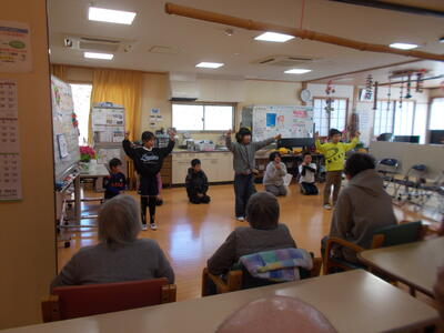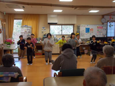 交流では、ダンス「ブリンバンバンボン」、リコーダー演奏「レッツゴーソーレ」、能楽「三番三」、合唱「いろんな木の実」を披露し、おじいちゃんおばあちゃんたちにはとっても喜んでもらいました。