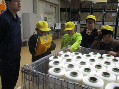 幅30mの布を織り上げる巨大な織機に子供たちはびっくりしていました。