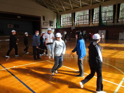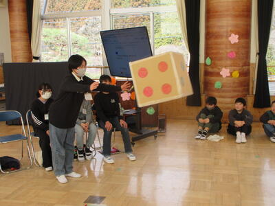 6年生が順番にジャンボサイコロを転がし、出た目の数のマスを進みます。止まったマスごとに6年生にミッションがありました。