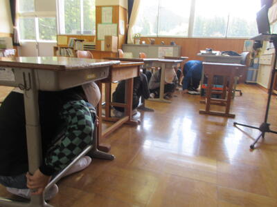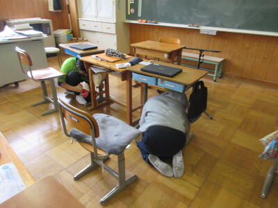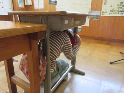10時30分、緊急地震速報が放送で流れ、訓練開始です。