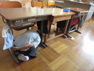 まずは、素早く机の下に避難し、安全を確保します。