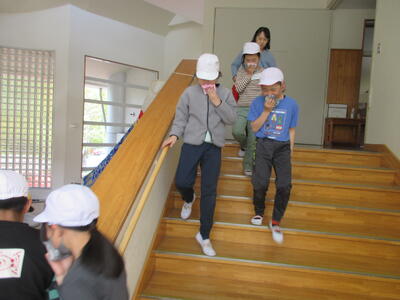 須賀川っ子は、ハンカチを口に当て、先生方の指示に従って整然と避難します。