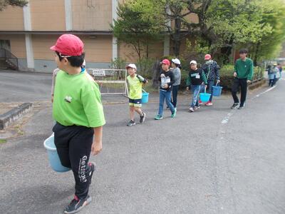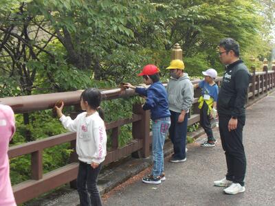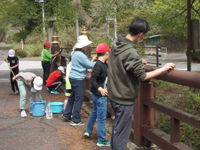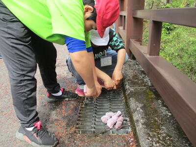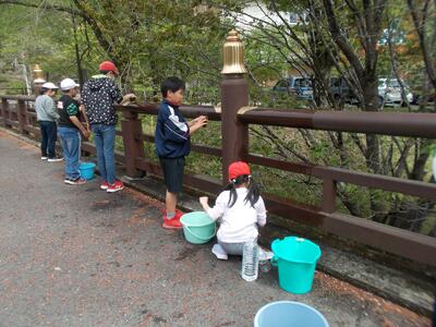 全校児童で、学校そばの心橋をきれいにします。