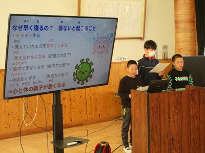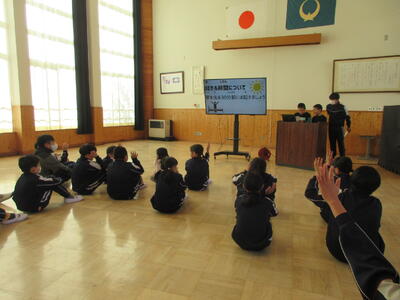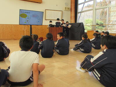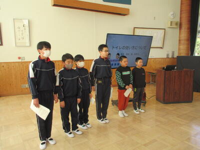 今日のさわやかタイムは、児童集会(給食保健委員会の発表)でした。気持ちのよいトイレの使い方や正しい生活習慣について、分かりやすく発表し、全校生に呼びかけました。