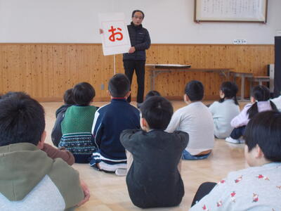今日は、生活科の授業の一環として、地域の吉成さん、湯本さん、佐藤さんをお招きして、1・2年生が昔あそびをしました。