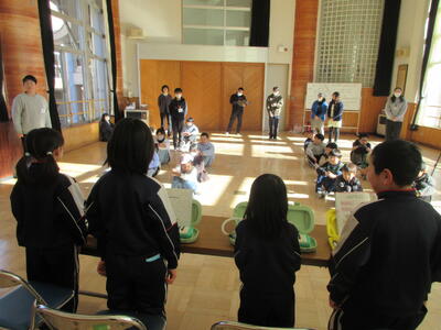 今日のさわやかタイムは、児童集会で1・2年生の発表でした。