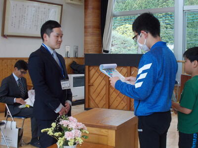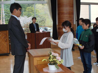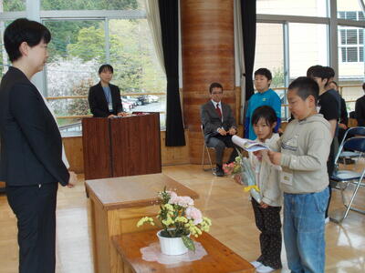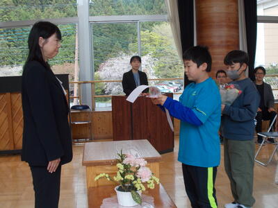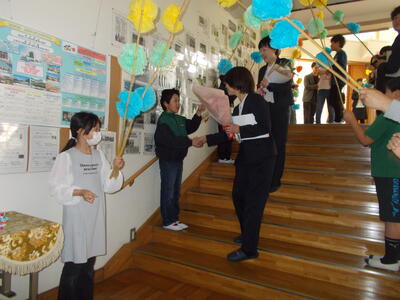 まずは、代表児童から、感謝のお手紙の発表と花束の贈呈です。
