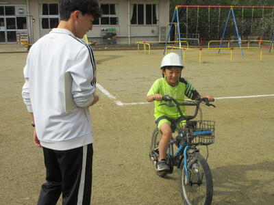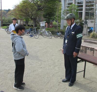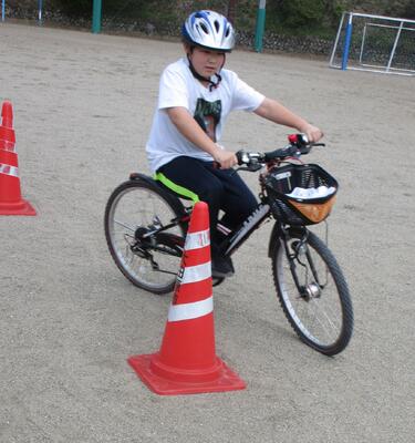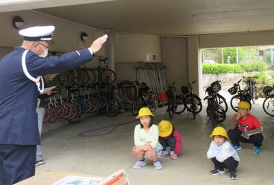はじめに、自転車の安全な乗り方やヘルメット着用の大切さ、そして自転車の交通ルールについて、交通教育指導員さんのお話を聞きます。