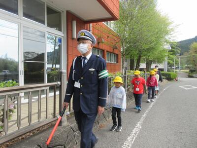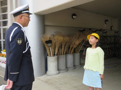 はじめに、交差点や横断歩道の安全な歩行について、交通教育指導員さんのお話を聞きます。